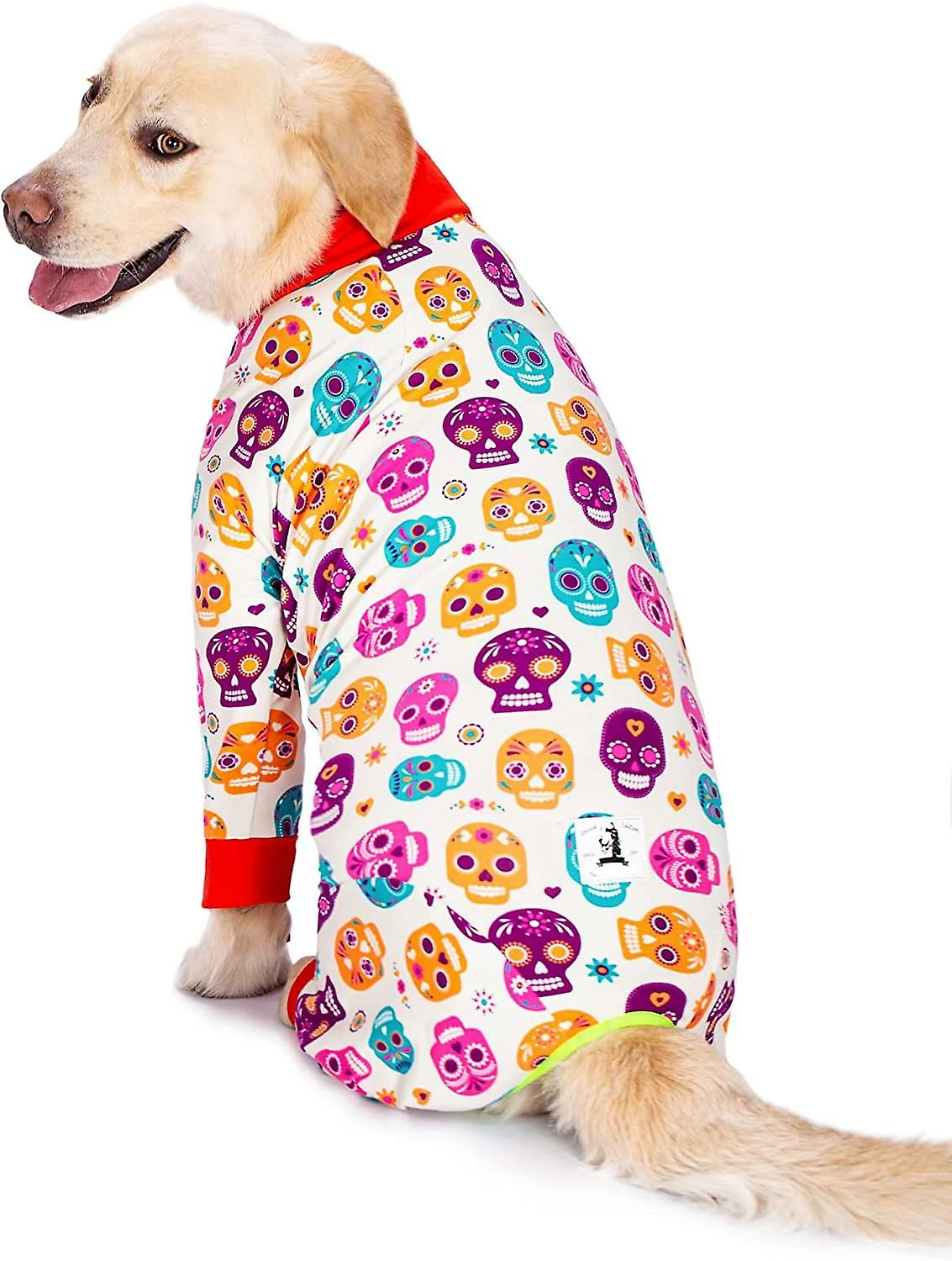 DOG PAJAMASThis large dog clothes,Perfect fit for medium and large dogs.Thin and elastic cottons material,not cold winter jacket,it is good as Jumpsuit Pajamas home clothes indoor sleeping,play with you. .ANTI-HAIR DUST-PROOFThis clothes soft and comfortable,Friendly to Skin. Breathability,machine washable,lovely cartoons painting design,Anti-hair Dust-proof,keep your bed clean,prevent the dog hair full of your bed,whether in outdoors, indoors sofa or cars. .POSTOPERATIVE RECOVERYThis clothes all-inclusive belly,good for female dog belly weaning.Support postoperative recovery,prevent pets from licking wounds, skin conditions, hot spots, allergies and infection. .JOINTS PROTECTThe Jumpsuit is with 4 legs design,protect the dog’s elbow joint from damage.Easy to put on ankd take off,perfect for every day wear, sleep time and photos.