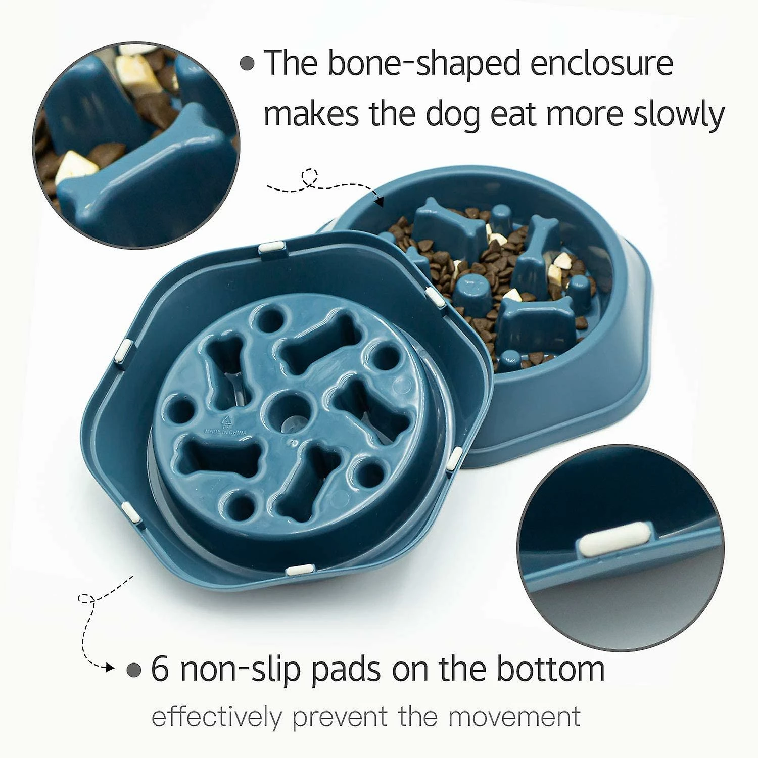 Help with Proper Digestion This design slow feeder dog bowl solve the common issues related to fast-eating dogs, such as bloating, choking, regurgitation, and obesity. Our slow eating bowl is both fun and challenging,engaging your dog while eating and effectively slow down dog’s eating time by 3X-5X.