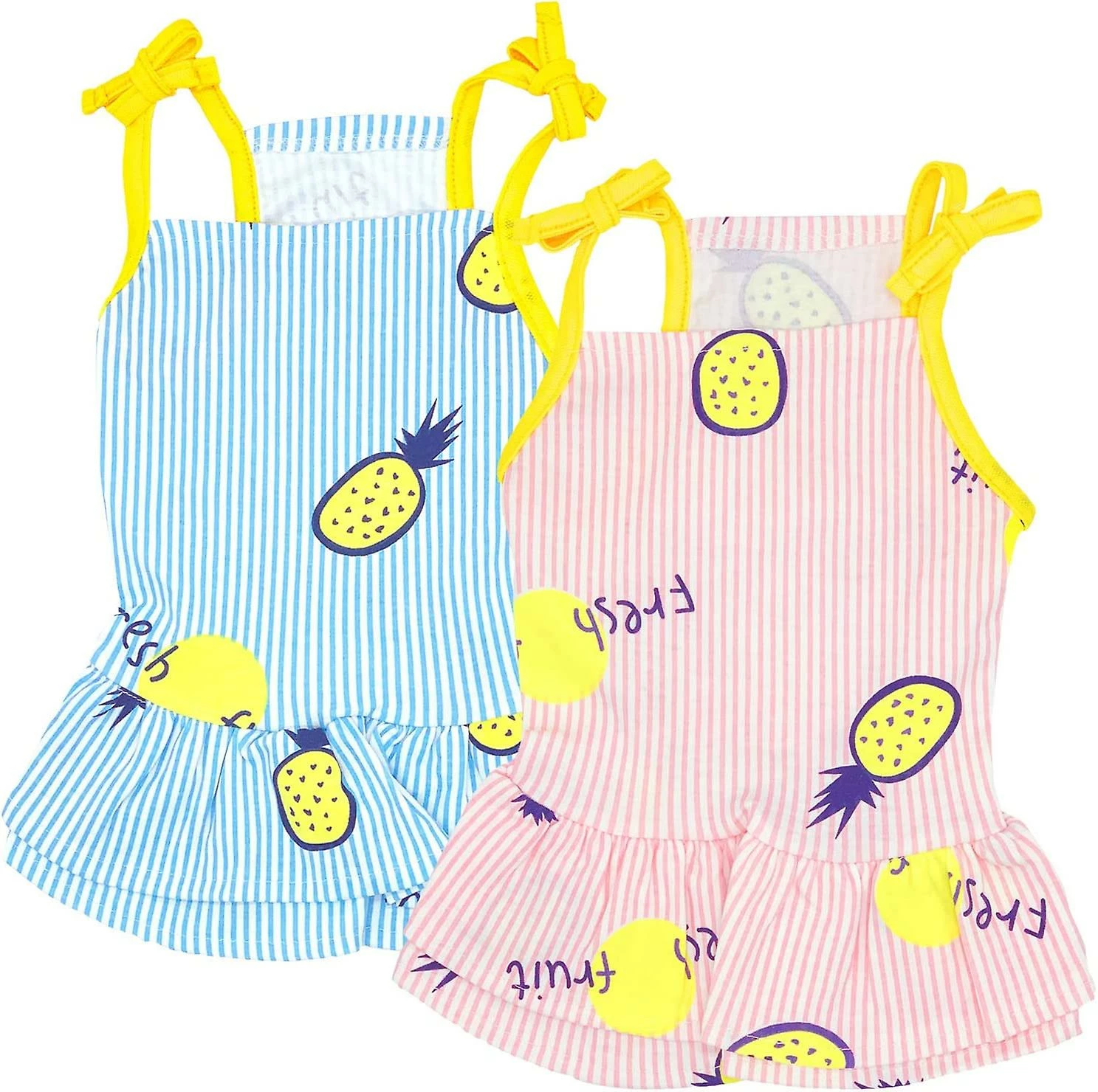 Striped Printed Clothes There are two styles for your choose: 2 piece/set tether pleated dresses with 2-tier ruffle hem pleated style; 2 piece/set sleeveless vest shirts style, These dog clothes with striped & letter & pineapple graphic printed design. Providing your dogs with adorable and charming appearance when wearing.