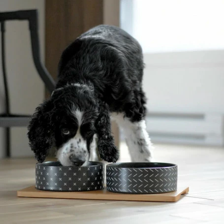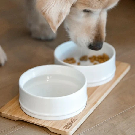 Ambiance tru00e8s nature avec ces superbes bols en cu00e9ramique, avec jolie empreinte patte au fond des bols, sur plateau en bambou avec pieds antidu00e9rapants.