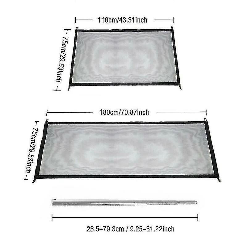 [Product material]: Nylon Mesh + Stainless Steel Tube [Product size]: Net 180 * 75cm, 110 * 75cm Tube shrink 23.5cm,elongation 80cm (Manual measurement, please understand if there are errors) [Product weight]: 1.8m 310g with opp bag 1.1m 260g with opp bag [Product packaging]: opp bag [Product packaging size]: 23.5 * 16.5 * 3.5cm bag How to use: Unfold the fabric woven Stretch two metal poles to the max length Put these two poles into the tunnels on both sides Fix the sticky hooks where you will install this magic gate Hang the fabric woven on the four hooks