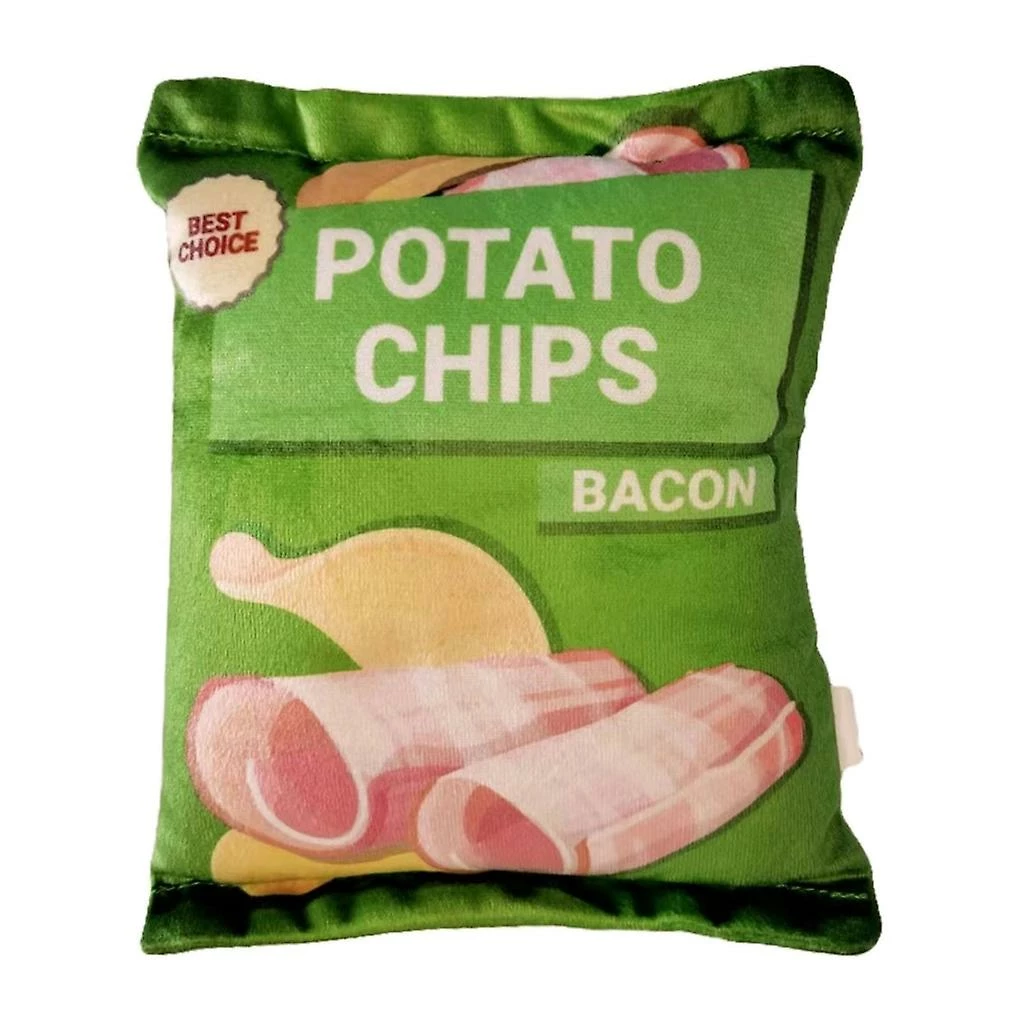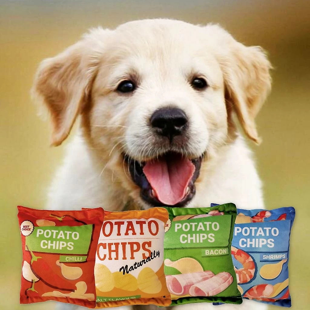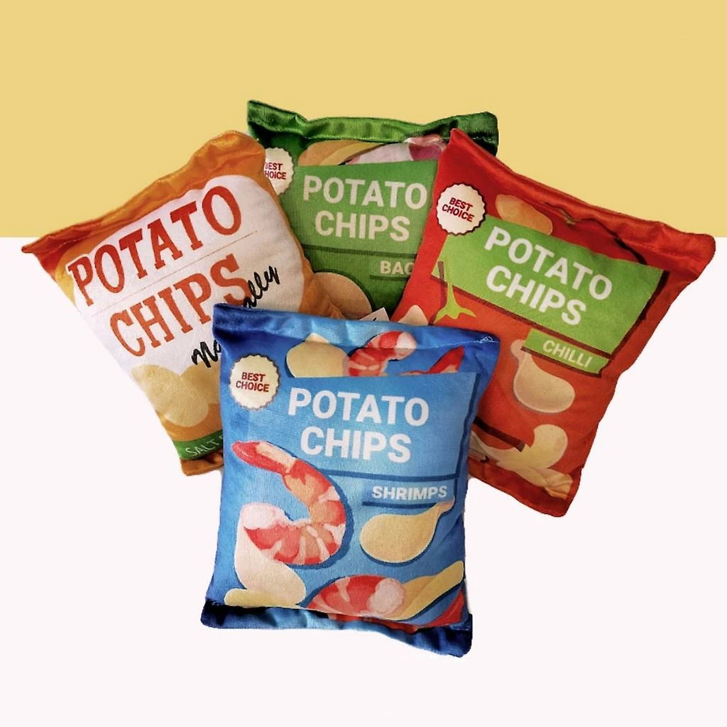 Squeak Plushes Toy: Potato chips bag design. Their bright colors are the dogs favorites.
