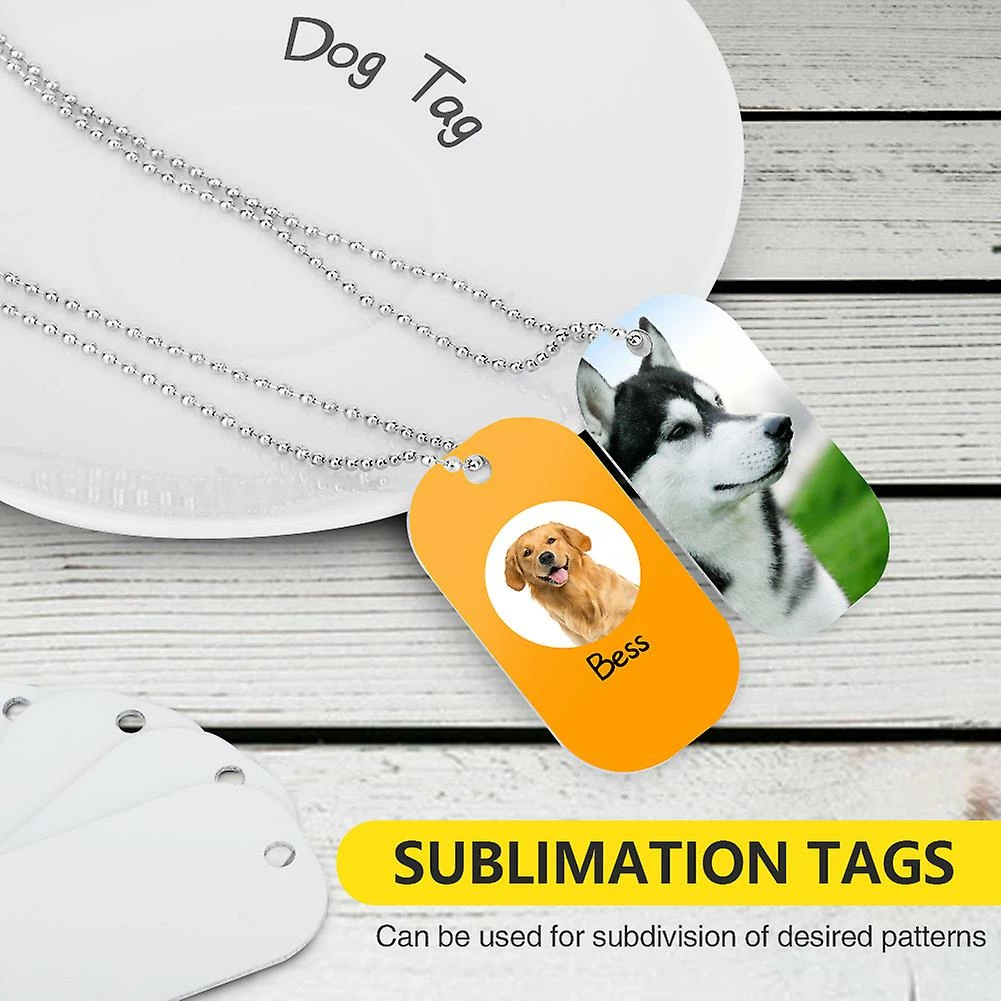 Features:PACKAGE CONTENTTwo type sets optional comes with 7pcs/15pcs sublimation blank aluminum dog tags 7pcs/15pcs dog tag chains and 1 roll of sublimation tape which can meet your various DIY needs and allow you to make different tags for pets.DURABLE MATERIALDurable for lasting use these white sublimation stamping tag pendants are made of aluminum light in weight and durable to use suitable for wearing and easy to carry not easy to break or deform can serve you and your pet for a long time.DIY SUBLIMATION TAGSAs these blank stamping tags allow to sublimate on both sides you can print on the sublimation paper and then tear the sublimation paper after printing on one side press with medium pressure to print a clear image the method is convenient for both DIY beginners and experienced people to operate.VARIOUS APPLICATIONSThese double sided tog tags are novel in shape and suitable for making signs pendants sublimation of desired patterns DIY crafts you will find more usages about these supplies such as key chains dog tags necklaces or just take them to stamp simple and meaningful words as gifts.AS GIFT CHOICEEach tag is designed with a small hole with which you can hang it conveniently. You can add a pretty design to make them a sweet gift for your family friends of course you can also make these tags for your pets.Description:You will get 7pcs/15pcs sublimation blank aluminum dog tags 7pcs/15pcs dog tag chains and 1 roll of sublimation tape which can meet your various DIY needs and allow you to make different tags for pets. Made of aluminum lightweight and durable to use suitable for wearing and easy to carry not easy to break or deform.Specification:Material: AluminumColor: WhiteDog Tag Size(LxW): About 15x10cm/5.91×3.94inchTag chains length: About 60cm/23.62inchTypes: A B(Different Set)Package includes:Type A:7pcs x Aluminum dog tag7pcs x Dog tag chains1roll x Sublimation tapeOrType B:15pcs x Aluminum dog tag15pcs x Dog tag chains1roll x Sublimation tapeNote:1. Due to the light and screen difference the item&