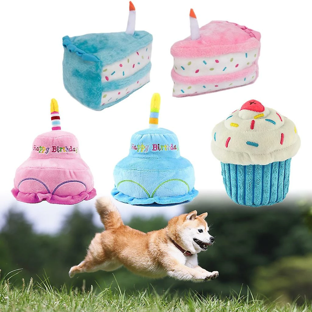 The birthday cake squeak toy is available in fun blue and pink colors, so you can choose the right toy for your dog.