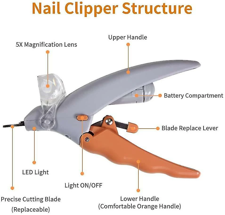Professional Pet Nail Clipper Scissors Pet Dog Cat Nail Toe Claw Clippers Scissor LED Light Nail Trimmer for Animals Pet SupplyFeature:1. Highlighted LED lamp beads, easy to find the blood line of cat nails.2. The stainless steel blade is sharp and does not jump.3. Anti-splash design, nails will not flick.4. There are five times magnifying glass on both sides of the knife edge cover, which is more convenient to use.Specification:Product Name: Pet Nail ClipperMaterial: ABS+Stainless Steel+LEDSize: 15*9*2.5cmDelivery Quantity: 1pcsProduct color: gray, orangeNote:Due to the different monitor and light effect, the actual color of the item might be slightly different from the color showed on the pictures. Thank youPlease allow 1-2cm measuring deviation due to manual measurement.